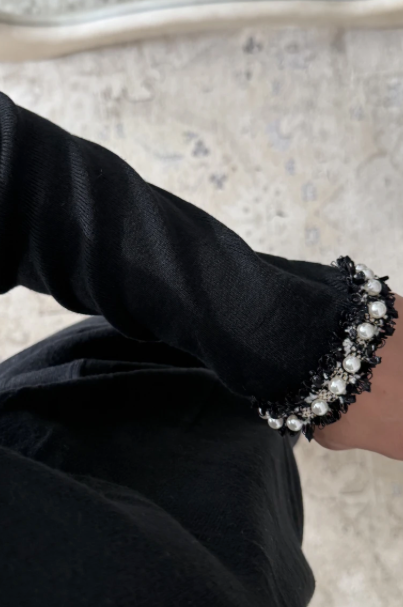 Set med en kort kofta utsmyckad med pärlor och en lång, rak kjol.
